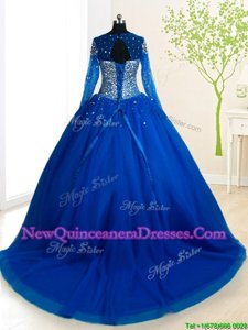 Free and Easy Scoop Royal Blue Long Sleeves Brush Train Beading With Train Quinceanera Gown