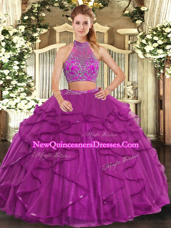 Fuchsia Criss Cross Halter Top Beading and Ruffled Layers Quinceanera Dress Tulle Sleeveless