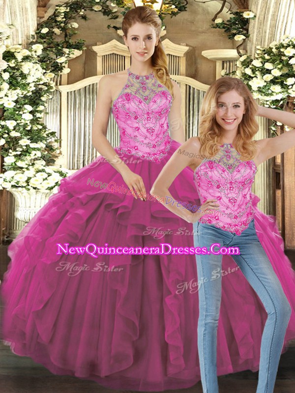 Fuchsia Quince Ball Gowns Military Ball and Sweet 16 and Quinceanera with Beading and Ruffles Halter Top Sleeveless Lace Up