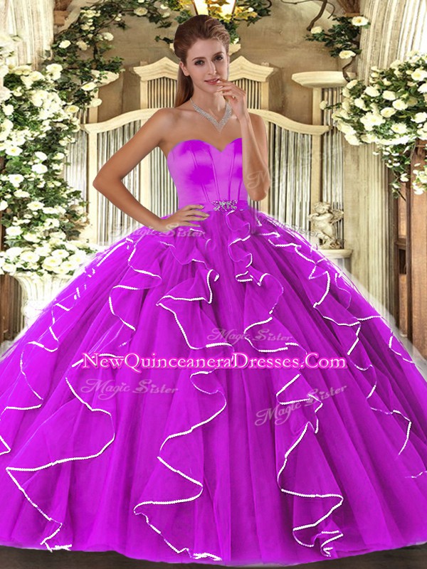 Fuchsia Sleeveless Beading and Ruffles Floor Length Quinceanera Dresses