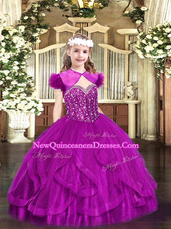 $ 207.00Fuchsia Tulle Lace Up Little Girls Pageant Dress Sleeveless Floor Length Beading and Ruffles