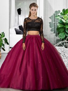 Fuchsia Two Pieces Scoop Long Sleeves Tulle Floor Length Backless Lace and Ruching Quince Ball Gowns