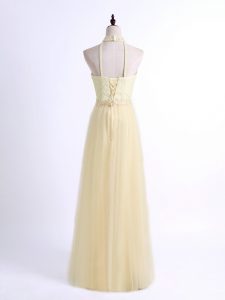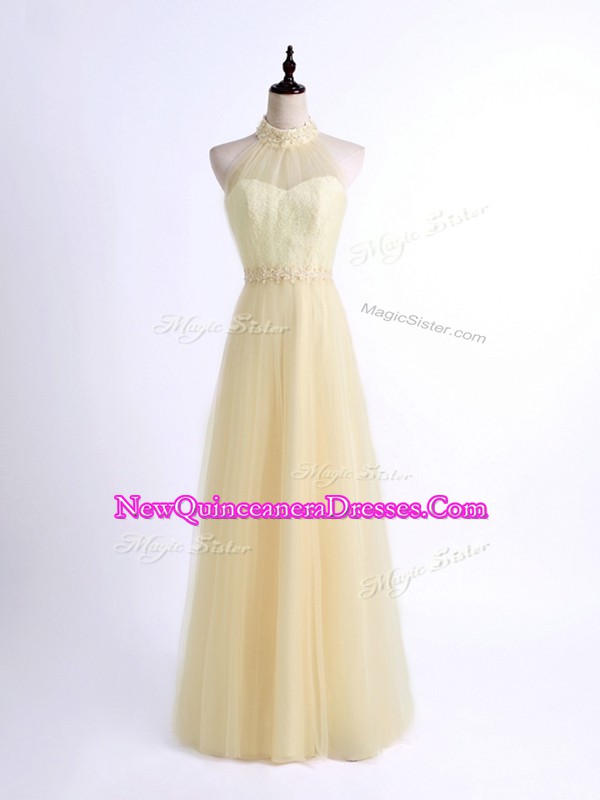 Glittering Floor Length Lace Up Vestidos de Damas Light Yellow for Prom and Party and Wedding Party with Lace and Appliques