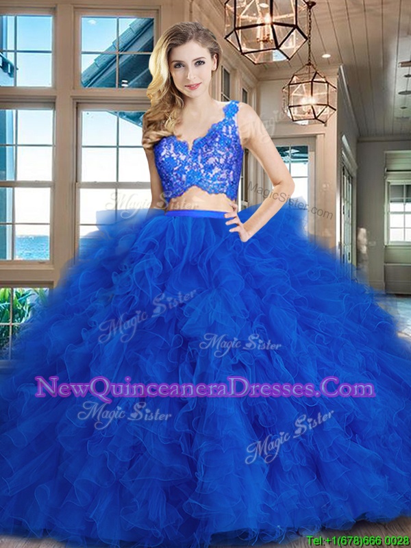 Glittering Royal Blue Tulle Zipper V-neck Sleeveless Quinceanera Dresses Brush Train Lace and Ruffles