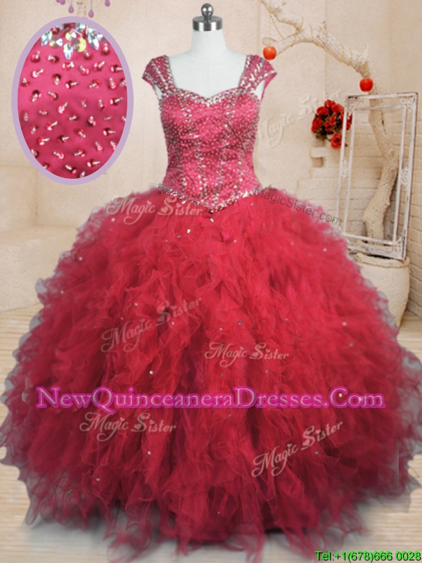 Glorious Red Square Neckline Beading and Ruffles Ball Gown Prom Dress Cap Sleeves Lace Up