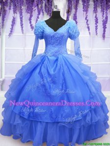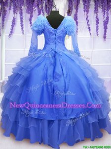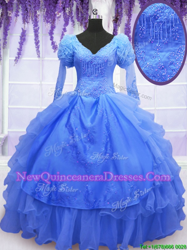 Gorgeous Blue Ball Gowns One Shoulder Long Sleeves Organza Floor Length Lace Up Beading and Embroidery and Hand Made Flower Quince Ball Gowns