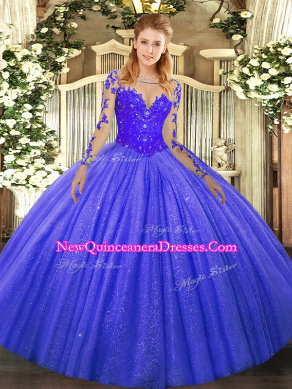 Gorgeous Blue Ball Gowns Tulle Scoop Long Sleeves Lace Floor Length Lace Up Quinceanera Gowns