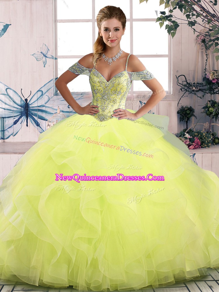 Gorgeous Yellow Green Off The Shoulder Neckline Beading and Ruffles Ball Gown Prom Dress Sleeveless Side Zipper