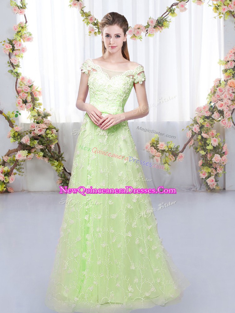 Graceful Floor Length Yellow Green Damas Dress Off The Shoulder Cap Sleeves Lace Up