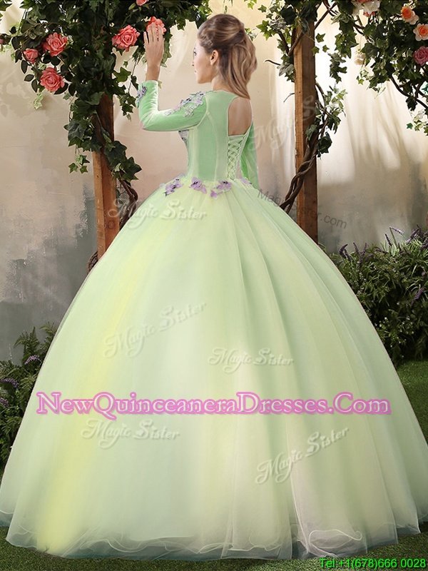 Romantic Scoop Apple Green Long Sleeves Appliques Floor Length Vestidos de Quinceanera