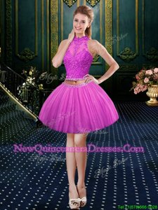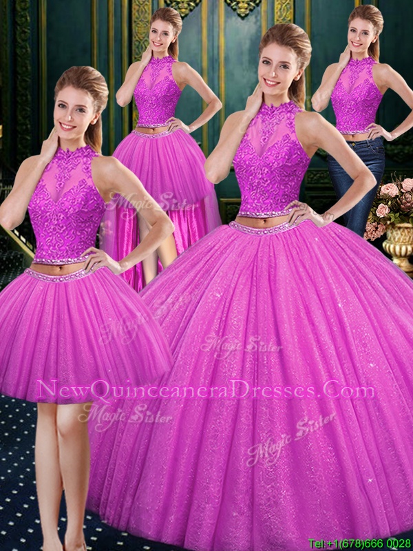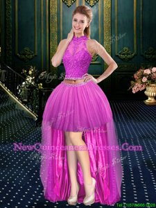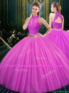Great Fuchsia High-neck Neckline Lace and Appliques Quinceanera Gowns Sleeveless Lace Up