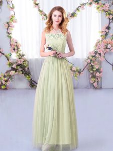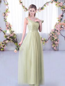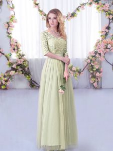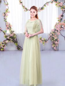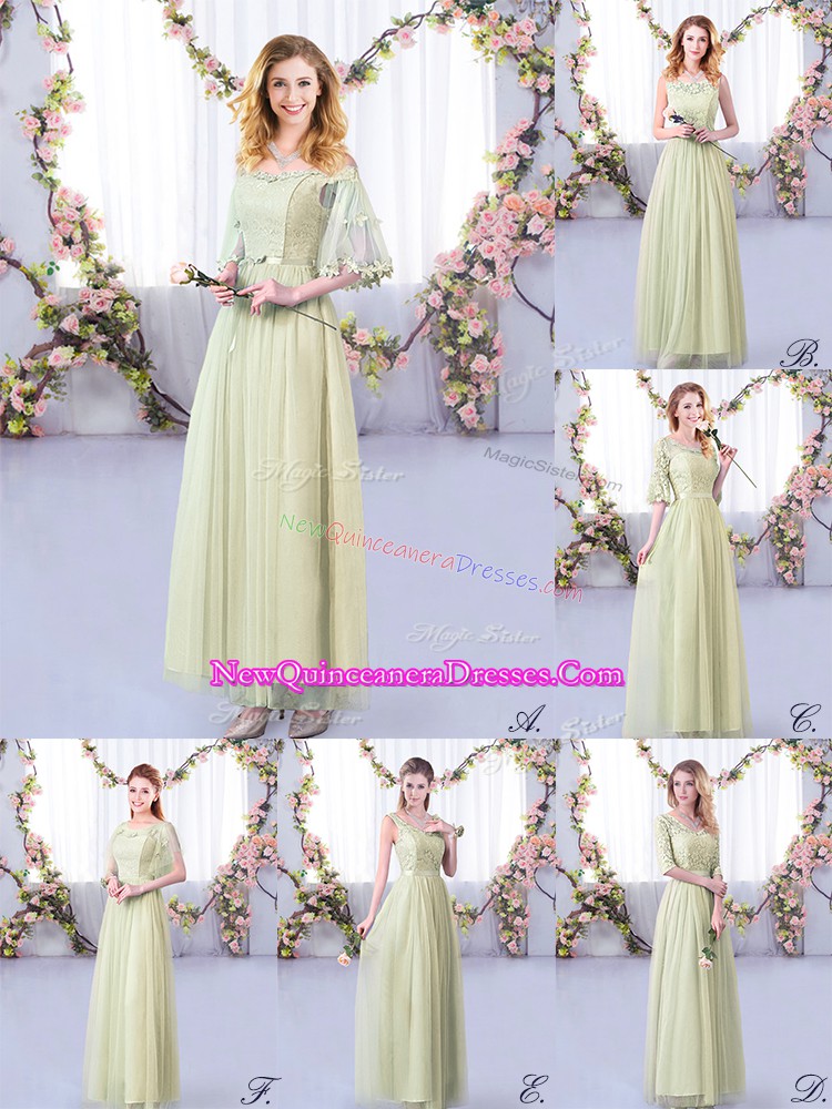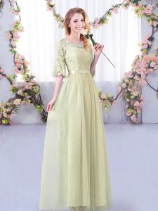 Great Yellow Green Half Sleeves Floor Length Lace and Belt Side Zipper Dama Dress