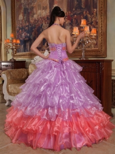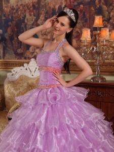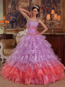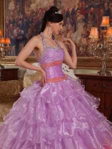 Discount Lavender Quinceanera Dress Halter Organza Beading Ball Gown