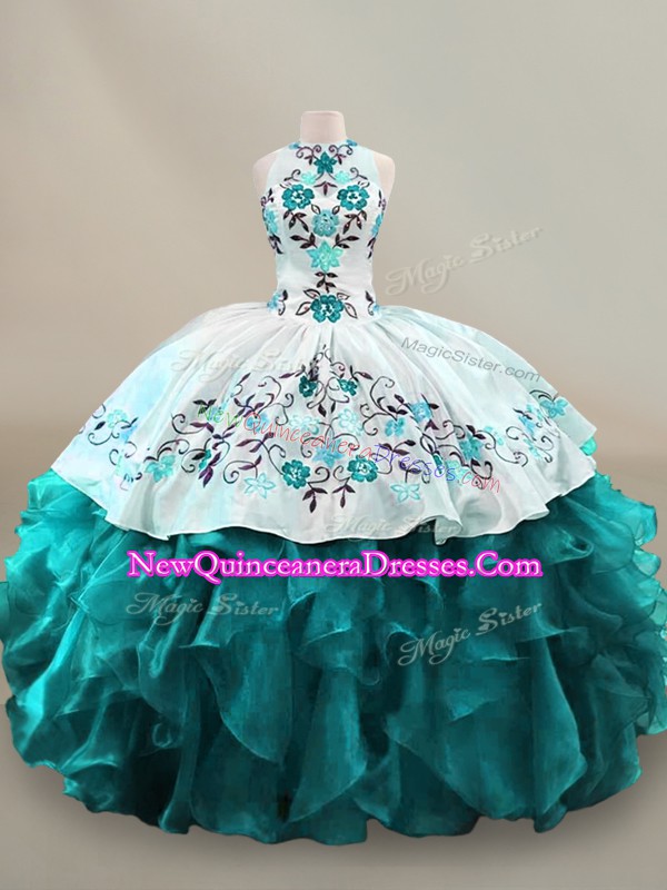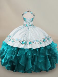 Halter Top Sleeveless Organza Quinceanera Dresses Embroidery and Ruffles Lace Up
