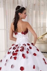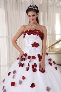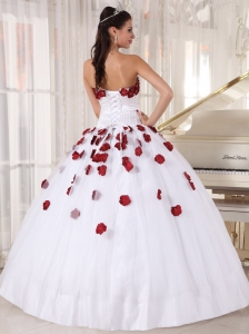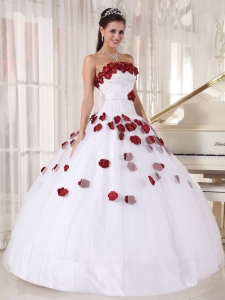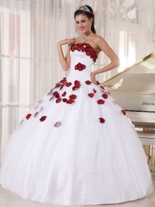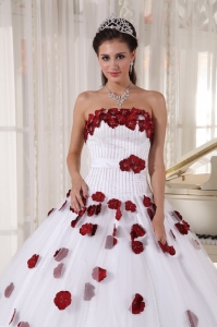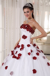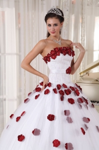 Formal White and Wine Red Quinceanera Dress Strapless Tulle Beading and Hand Made Flowers Ball Gown
