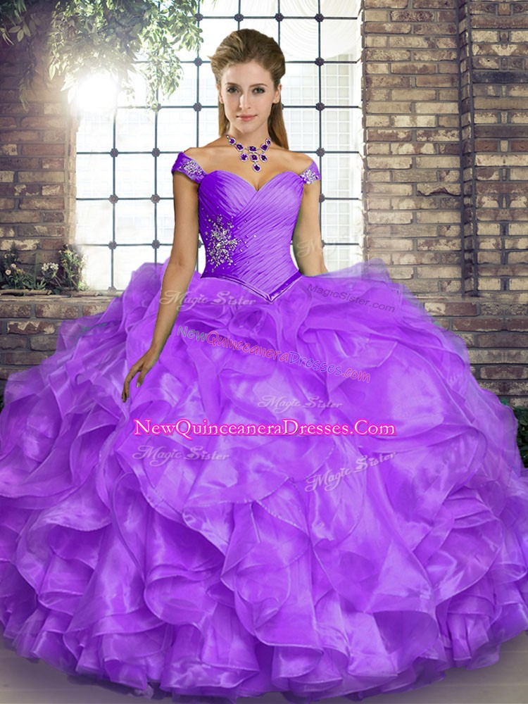 High Quality Off The Shoulder Sleeveless Organza Sweet 16 Dresses Beading and Ruffles Lace Up