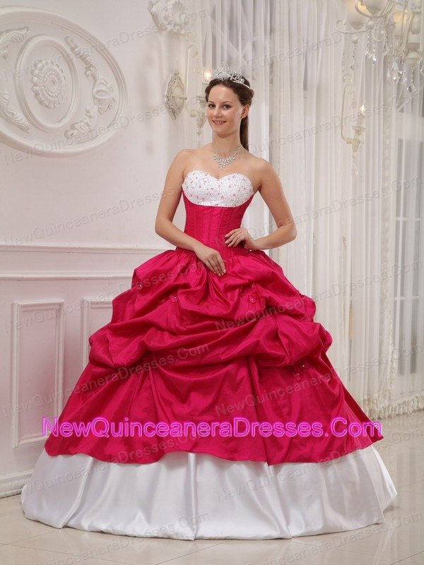Popular Hot Pink and White Sweet 16 Dress Sweetheart Taffeta Beading and Pick-ups Ball Gown