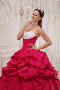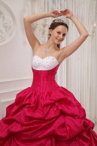 You only get one opportunity to have your quinceanera, so please make sure your dress is a memorable with this quinceanera look. This red and white quinceanera is your choice. The strapless bodice with a sweetheart neckline and all dainty shimmering beadings makes the gown so elegant and exquisite. The asymmetrically ruched bodice in contrasting color made from the stunning taffeta fabric creates a beautiful shape.A lace up back completes the look.
