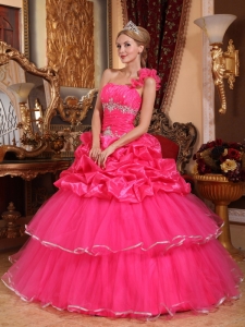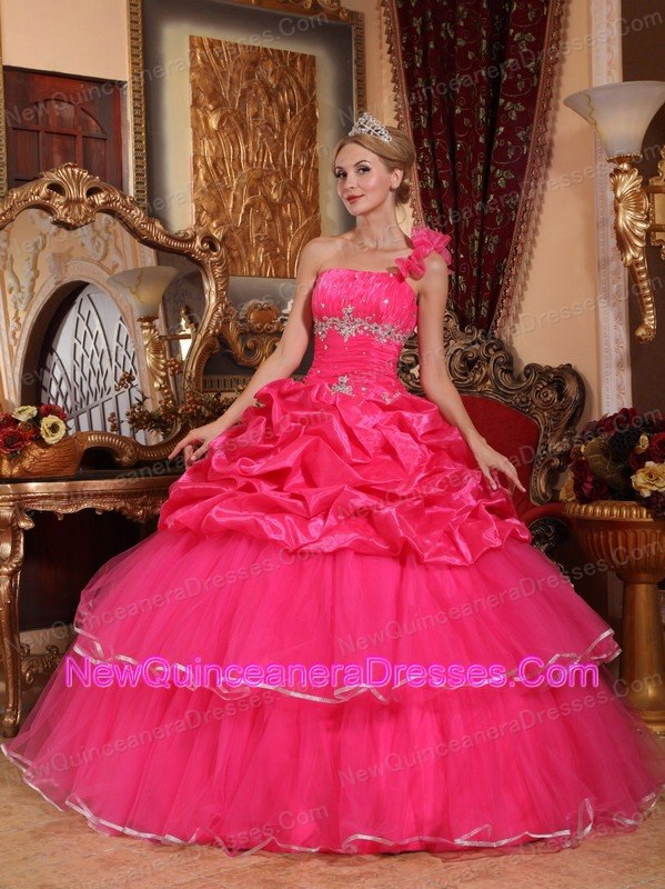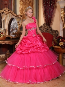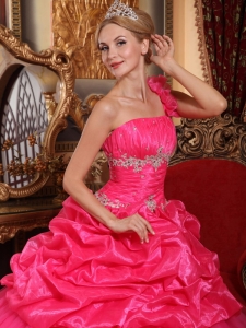 Discount Hot Pink Quinceanera Dress One Shoulder Organza Beading and Pick-ups Ball Gown