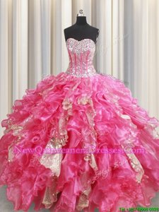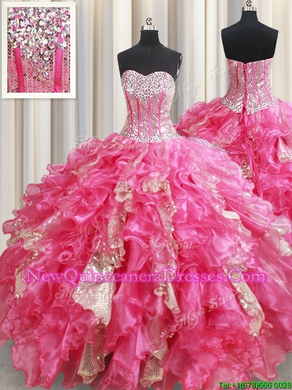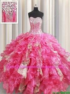 Hot Pink Sweetheart Neckline Beading and Ruffles and Sequins Sweet 16 Dresses Sleeveless Lace Up