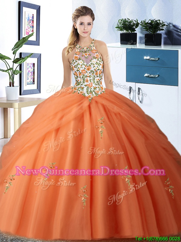 Hot Sale Halter Top Orange Lace Up Sweet 16 Quinceanera Dress Embroidery and Pick Ups Sleeveless Floor Length