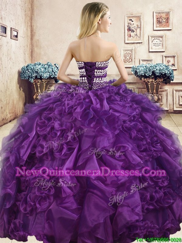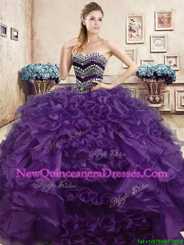 Hot Selling Purple Ball Gowns Sweetheart Sleeveless Organza Floor Length Lace Up Beading and Ruffles Sweet 16 Quinceanera Dress