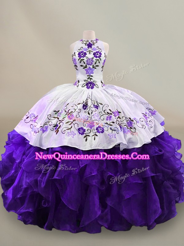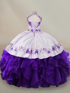 Ideal Ball Gowns Sweet 16 Quinceanera Dress White And Purple Halter Top Organza Long Sleeves Floor Length Lace Up