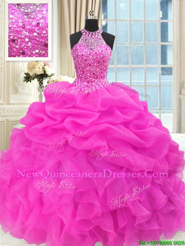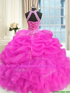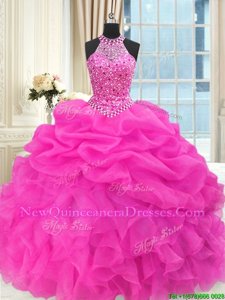 Ideal Hot Pink Ball Gowns High-neck Sleeveless Organza Floor Length Lace Up Beading and Pick Ups 15th Birthday Dress