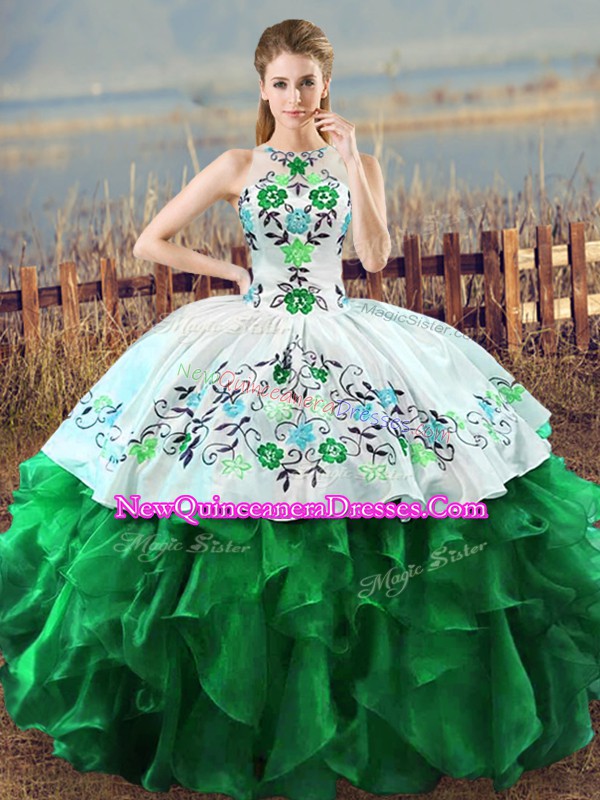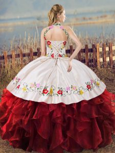 Inexpensive Halter Top Sleeveless Organza Quinceanera Dresses Embroidery and Ruffles Lace Up