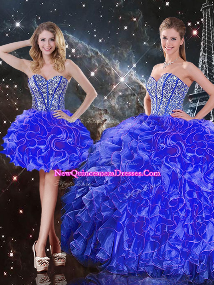 Flare Floor Length Royal Blue Quince Ball Gowns Organza Sleeveless Beading and Ruffles