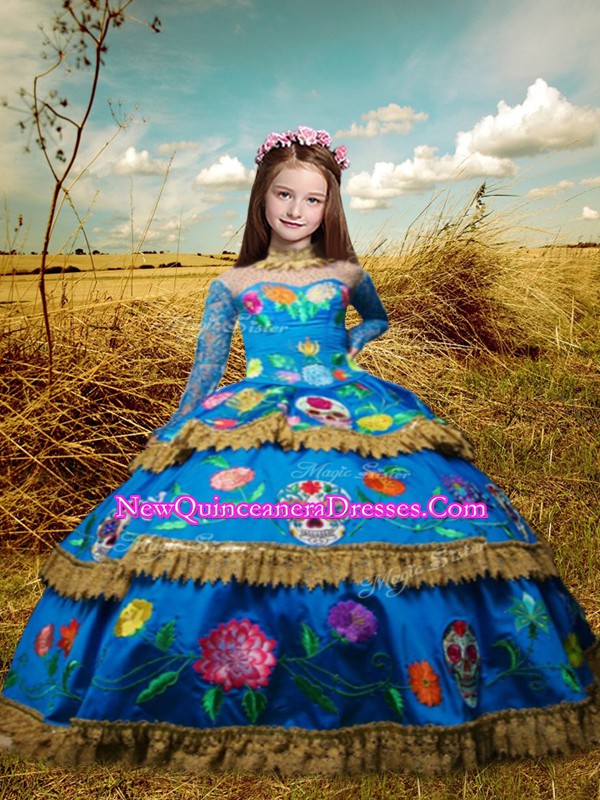 Latest Blue Taffeta Lace Up High-neck Long Sleeves Floor Length Little Girl Pageant Dress Embroidery