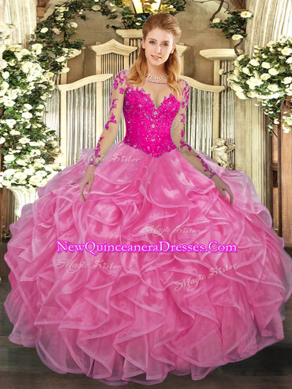 Latest Rose Pink Scoop Lace Up Lace and Ruffles Vestidos de Quinceanera Long Sleeves