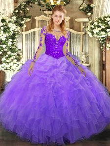 Lavender Lace Up Quinceanera Dresses Lace and Ruffles Long Sleeves Floor Length