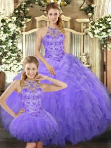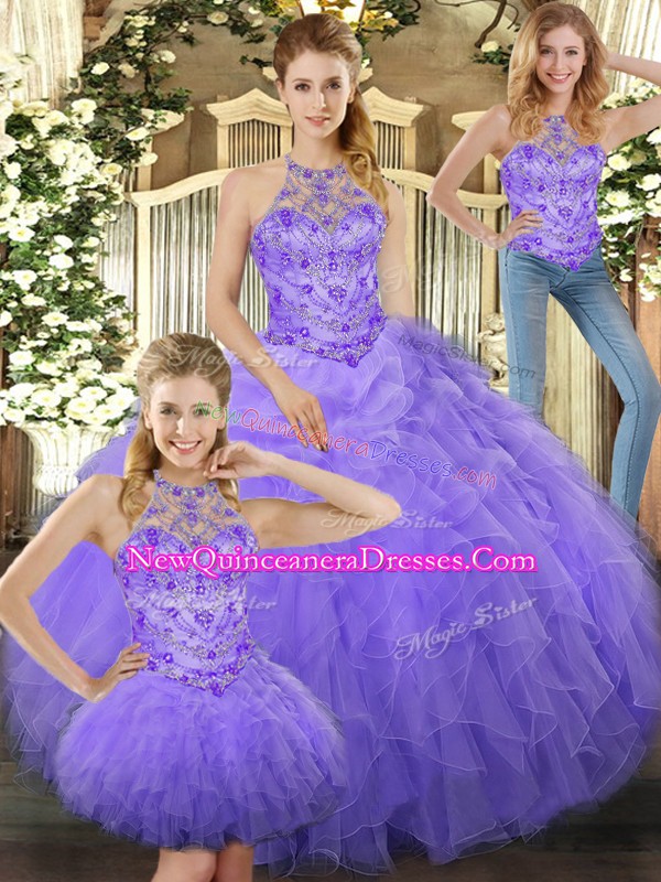 Lavender Three Pieces Halter Top Sleeveless Tulle Floor Length Lace Up Beading and Ruffles Quinceanera Dress