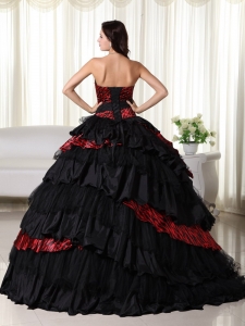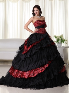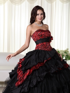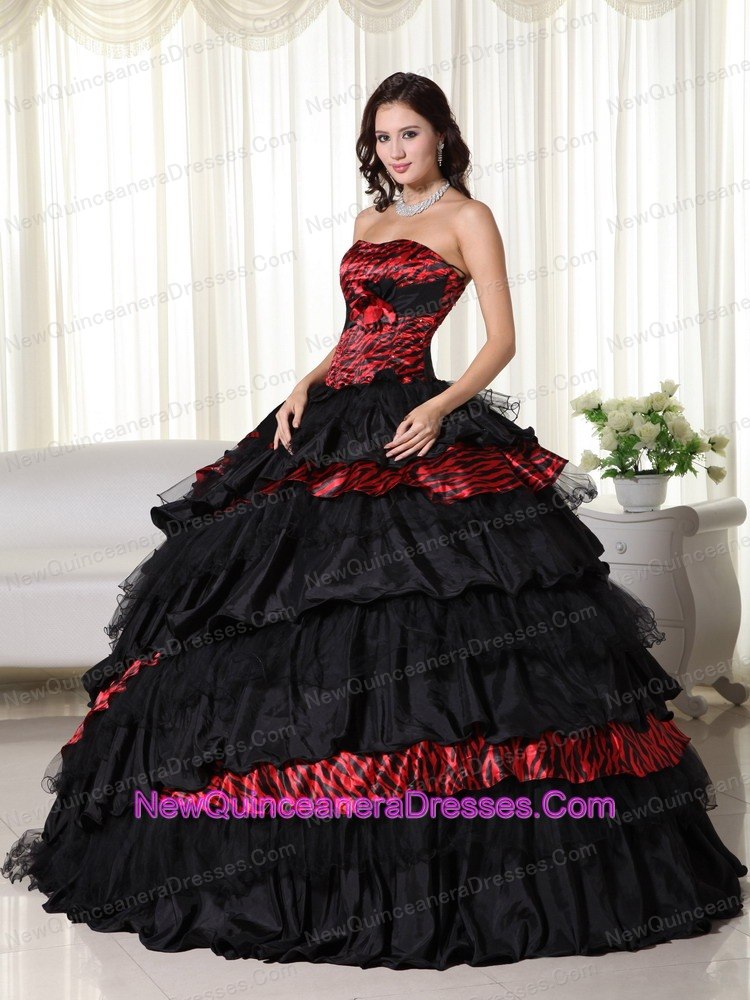 Look fabulous on your big day in this red and black zebra print quinceanera dress. This amazing gown is sophisticated and modern. This strapless gown has a gentle sweetheart neckline and a black band accent the waist. An eye-catching floral accent punctuates one side of the fitted waistline. Tiers of tulle create layers for a voluminous skirt that will look flawless in pictures commemorating this special moment.