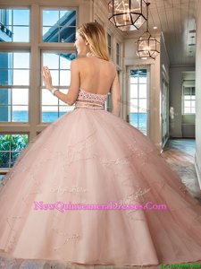 Luxurious Halter Top Floor Length Backless Quinceanera Gowns Aqua Blue and In for Military Ball and Sweet 16 and Quinceanera withBeading and Ruffles