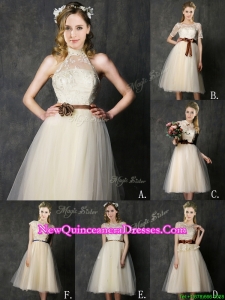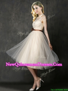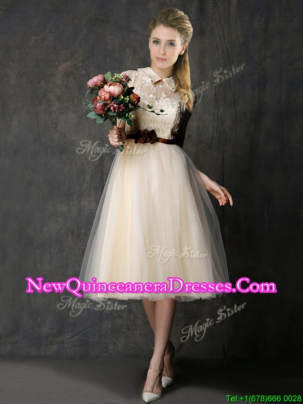 , Luxurious High Neck Champagne Dama Dress with Hand Made Flowers and Lace