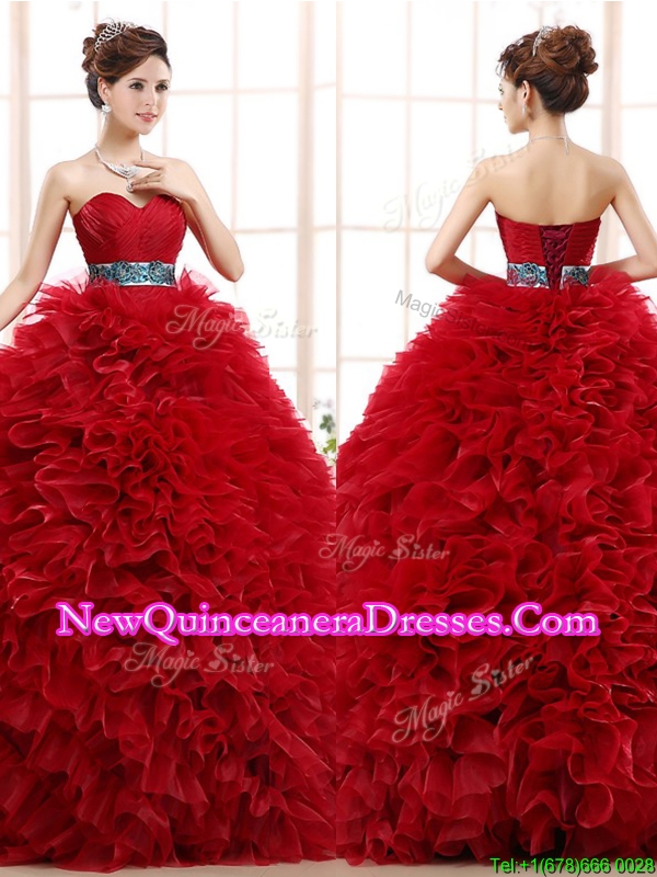 Luxurious Sashed and Ruffled Sweet 16 Dress in Wine Red