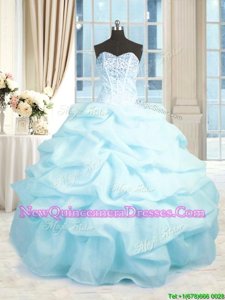 Most Popular Baby Blue Ball Gowns Sweetheart Sleeveless Organza Floor Length Lace Up Beading and Ruffles Quince Ball Gowns