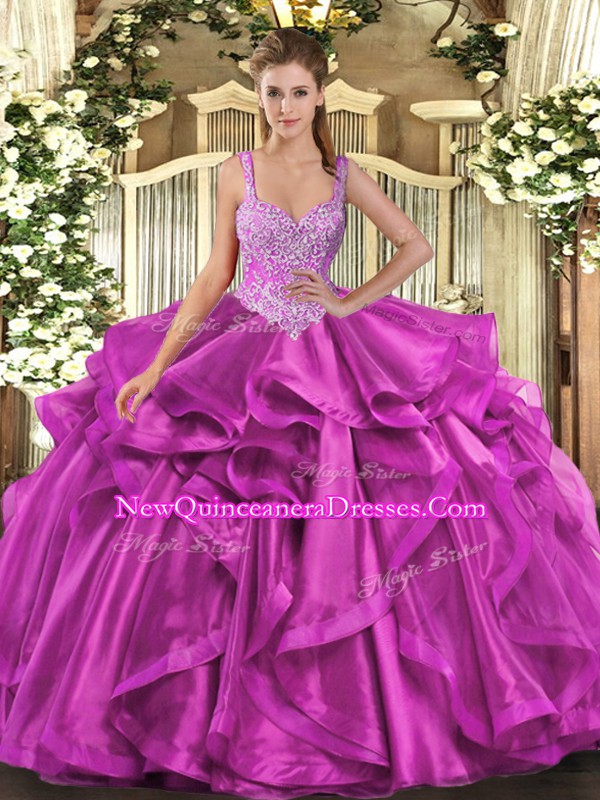 Most Popular Fuchsia Sleeveless Organza Lace Up 15th Birthday Dress for Military Ball and Sweet 16 and Quinceanera