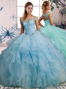 Most Popular Light Blue Off The Shoulder Neckline Beading and Ruffles Sweet 16 Dresses Sleeveless Lace Up