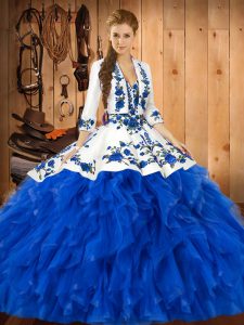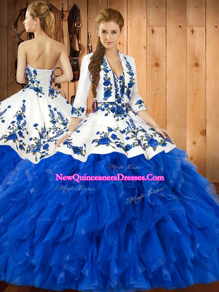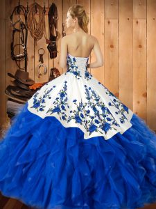 Noble Satin and Organza Sweetheart Sleeveless Lace Up Embroidery and Ruffles Quince Ball Gowns in Blue