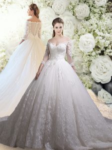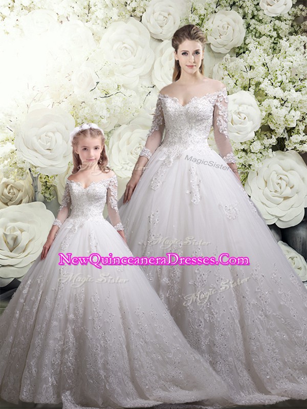 Off The Shoulder Half Sleeves Tulle Sweet 16 Dresses Lace Chapel Train Zipper