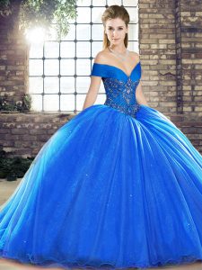 Off The Shoulder Sleeveless Sweet 16 Dresses Brush Train Beading Royal Blue Organza