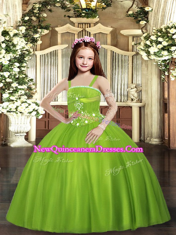 Olive Green Ball Gowns Straps Sleeveless Tulle Floor Length Lace Up Beading Little Girls Pageant Dress Wholesale