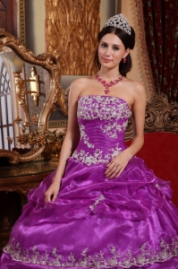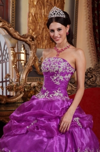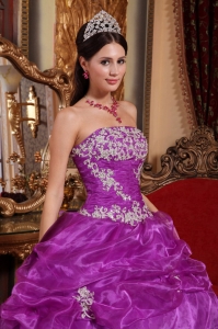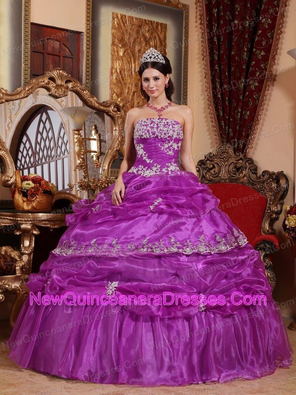 purple prom dresses in organza fabric, Fashionable Purple Quinceanera Dress Strapless Organza Appliques Ball Gown