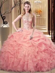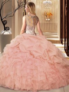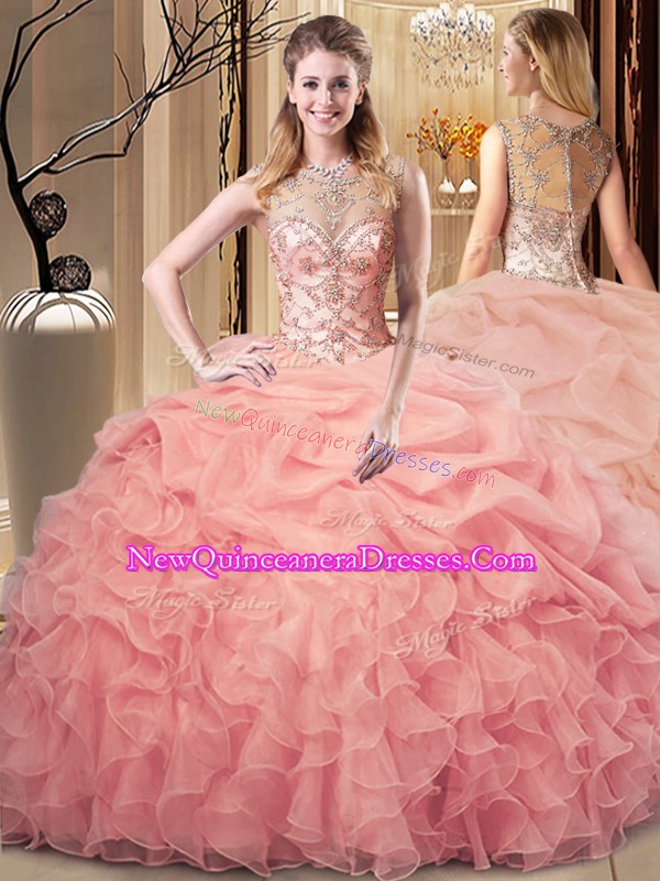 Peach Organza Zipper Scoop Sleeveless Floor Length Sweet 16 Quinceanera Dress Beading and Ruffles