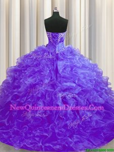 Sleeveless Organza Sweep Train Lace Up Sweet 16 Dresses inFuchsia withBeading and Ruffles