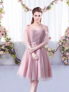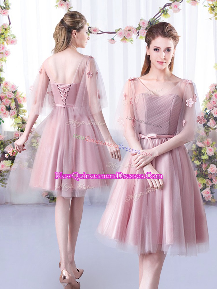 Pink A-line Tulle V-neck Sleeveless Appliques and Belt Knee Length Lace Up Dama Dress for Quinceanera