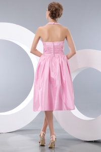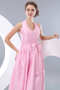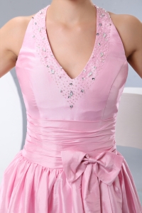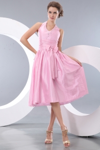 Pink Empire Halter Tea-length Taffeta Beading and Bowknot Dama dresses